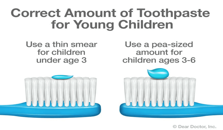 Age < 3 years, parents should smear no more toothpaste than the size of a grain of rice on a child’s toothbrush.